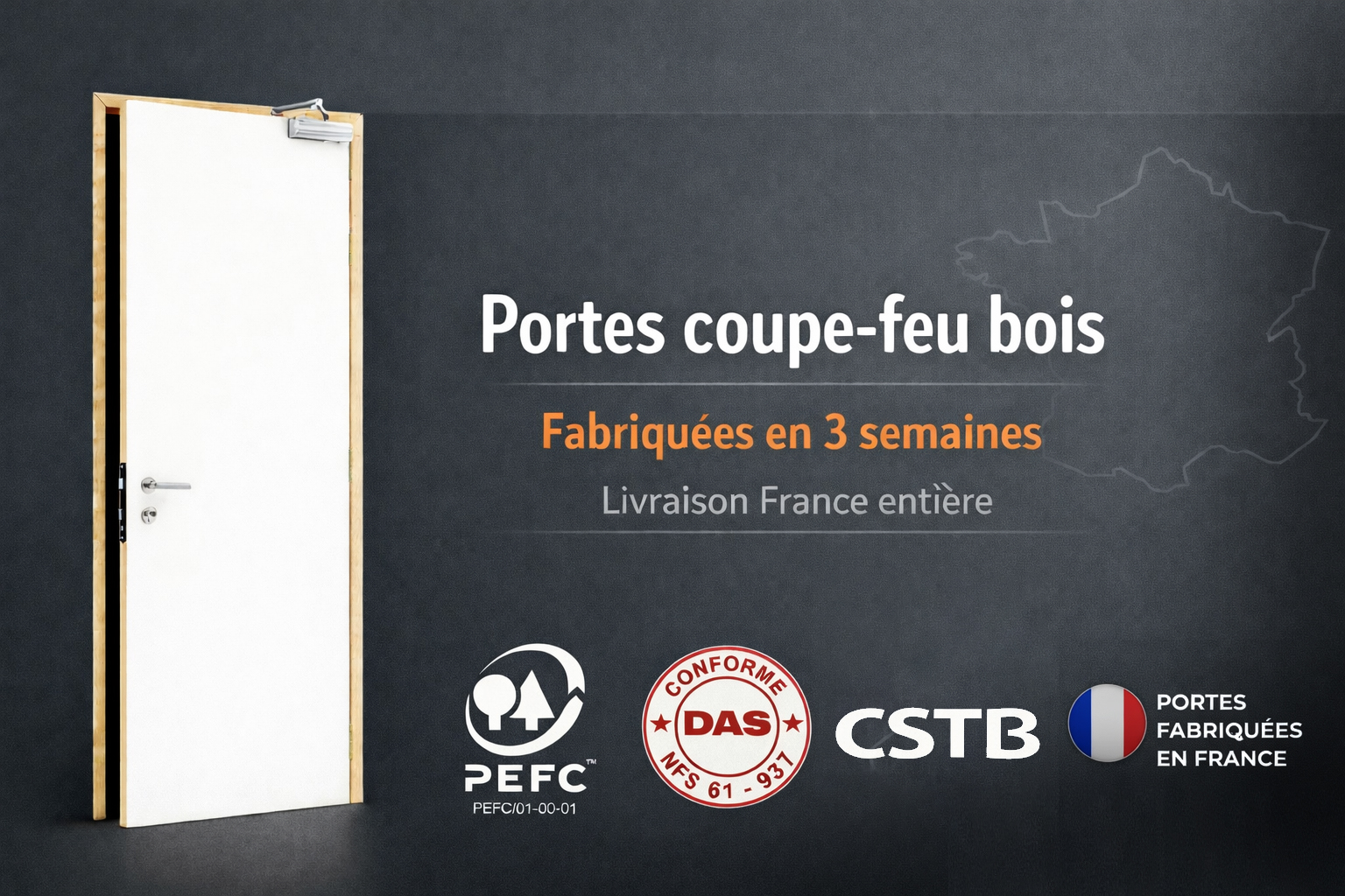 Afin de répondre à vos demandes les plus spécifiques pour le compartimentage des ERP (commerce, bureau, hôtel, restaurant, crèche etc..) , l’entreprise INDUSTRIMAT a développé une gamme complète de portes en bois multi-usage et coupe-feu (30, 60 et 120 minutes). Nos menuiseries bois sont fabriquées dans un délai de 3 semaines afin de satisfaire vos chantiers les plus urgents, que ce soit en dimensions standards ou sur mesure. Nos menuiseries sont disponibles en fonctionnement simple ou double action (va et vient), et disposent d’une large gamme d’accessoires et de finitions. L’ensemble de nos portes coupe-feu sont certifiées par un procès-verbal CSTB conformément à la réglementation nationale.